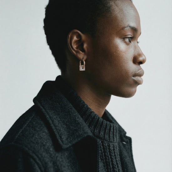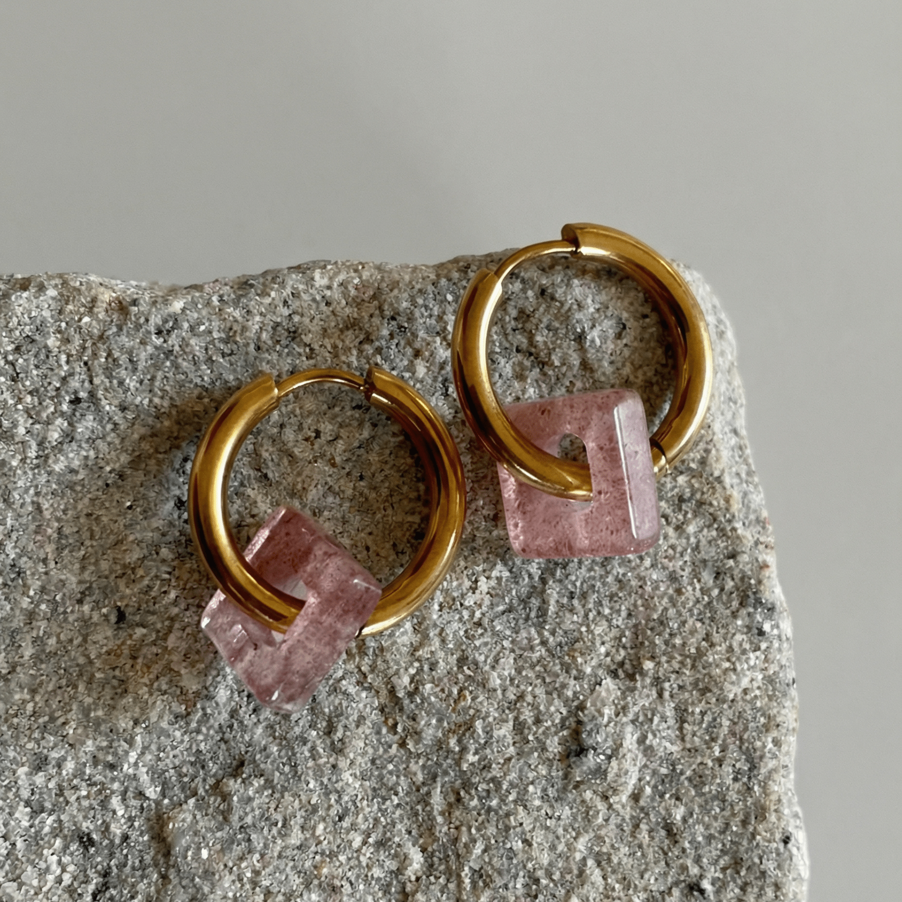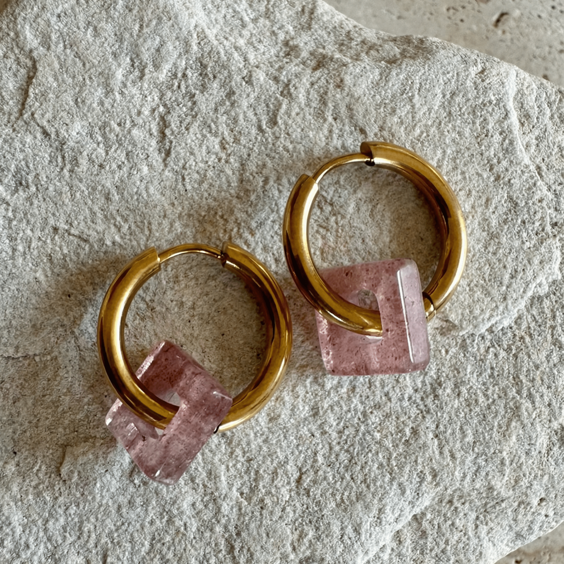 The LETGOFLOW Strawberry Quartz Creoles SQUARE are stylish hoop earrings with an 80's style and beautiful strawberry quartz earring pendants.